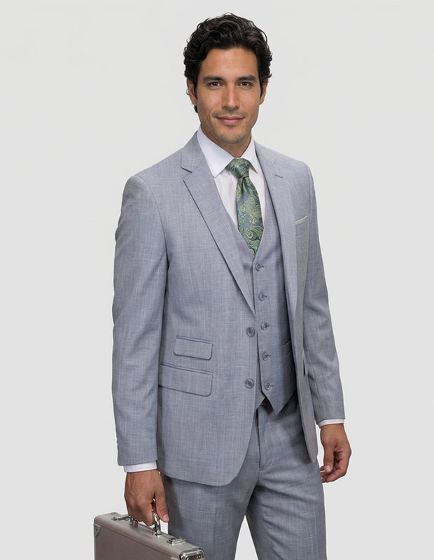 A refined three-piece suit crafted from premium sharkskin Italian wool for a sleek, modern look.